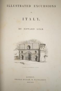 ° Lear, Edward - Illustrated Excursions in Italy, 4to, half title, title-page with lithographed vignette, full-page map hand-coloured in outline, 30 sepia-tinted lithographed plates, 4pp. of sheet music bound at rear, original green cloth blocked in gilt and blind, Thomas McLean, London, 1846. Note: A second volume was published in the same year.