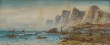 Lot 1711 , Lennard Lewis (1826-1913), coastal view with fishermen, signed, watercolour, 22 x 49cm