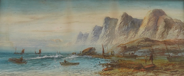 Lennard Lewis (1826-1913), coastal view with fishermen, signed, watercolour, 22 x 49cm