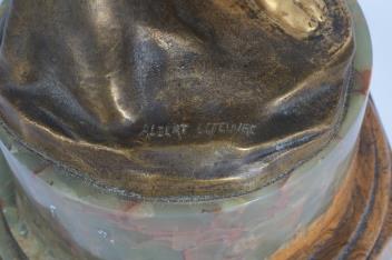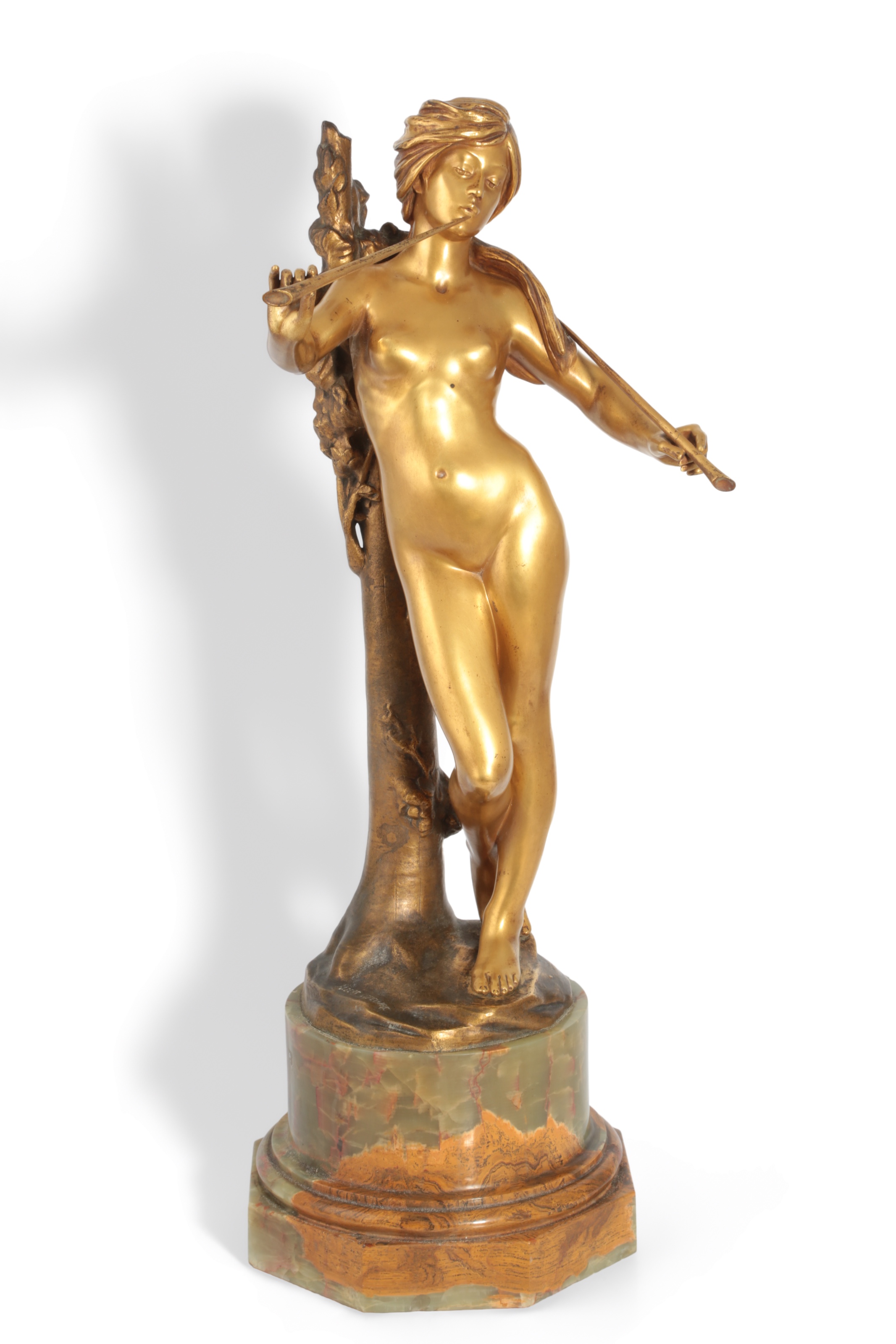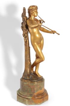 Louis-Albert Lefeuvre (French, 1845-1924) 'Muse des Bois', a classical nude maiden playing the pipes, modelled leaning against a tree stump, signed "ALBERT LEFEUVRE" and with foundry mark to the base, raised on a onyx socle, 67cm high overall