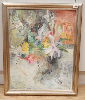 Lot 1740 , Maggie Townsend (contemporary), still life of flowers in a vase, signed, abstract oil on board, 60 x 48cm