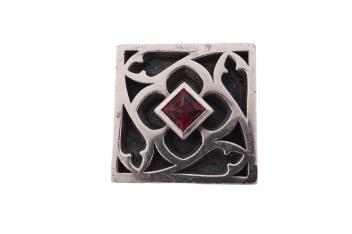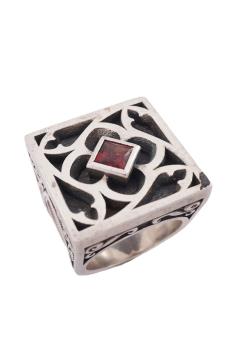 Mark Eames, a silver and garnet ring, circa 2015, of gothic inspiration, the square front with gothic tracery, centring on a garnet, the shoulders decorated with skulls, size S1/2, British hallmarks, sponsor's mark ME, gross weight approximately 46 grams, case stamped Mark Eames