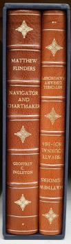 ° Matthew Flinders: the De Luxe and Complete Edition (of 550 numbered sets), 2 vols. Comprising: Ingleton, Geoffrey C. - Matthew Flinders: navigator and chartmaker ... pictorial title, coloured frontis. and 16 coloured plates, 16 b/w. plates, num. text illus. and folded chart (outline colour); publisher's gilt ruled chocolate quarter morocco and cloth (gilt portrait silhouette upper cover and gilt facsimile signature on lower), gilt decorated panelled spine, ge., 4to; Flinders, Matthew - Private Journal 1803-1814: the Mitchell Library Manuscript. pictorial title, frontis. (map) and 362pp. of facsimile manuscript (and 2pp. introductory note); uniform binding with first volume, and both contained in publisher's labelled slipcase. Guildford: Genesis Publications, 1986