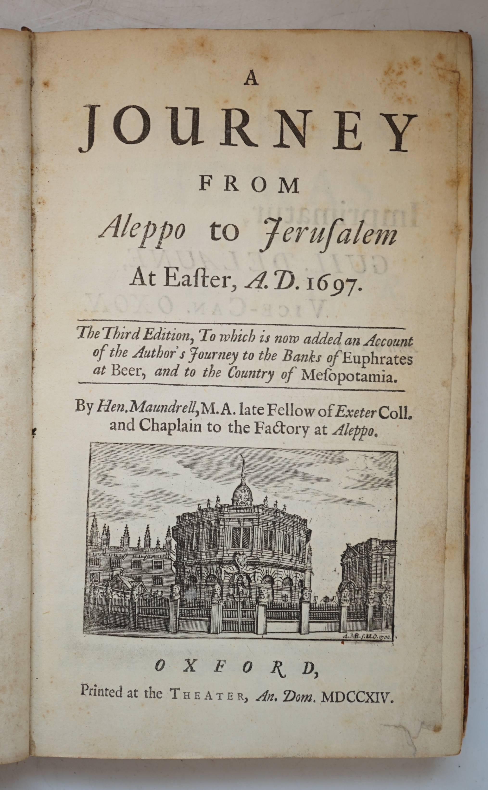 ° Maundrell, Henry - A Journey from Aleppo to Jerusalem at Easter, A.D. 1697. 3rd edition (with additionally, a Journey to the Euphrates & to Mesopotamia). 2 folded views, 13 other plates (7 folded) and engraved text illus.; contemp. blind-decorated panelled calf, front board detached, spine re-labelled, ink ownership inscription to front fly-leaf, Oxford: printed at the Theater, 1714.