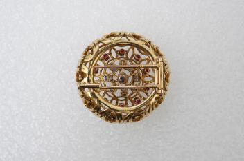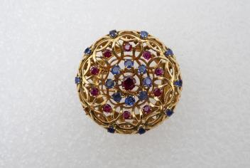 Mellerio dits Meller, a ruby and sapphire brooch, mid 20th century, of circular design in gold openwork, set with circular-cut sapphires and rubies, 3.6cm, diameter, signed Mellerio Paris 1806 Br, French assay marks for 18ct gold and partial maker's marks, gross weight approximately 24.5 grams, one sapphire deficient