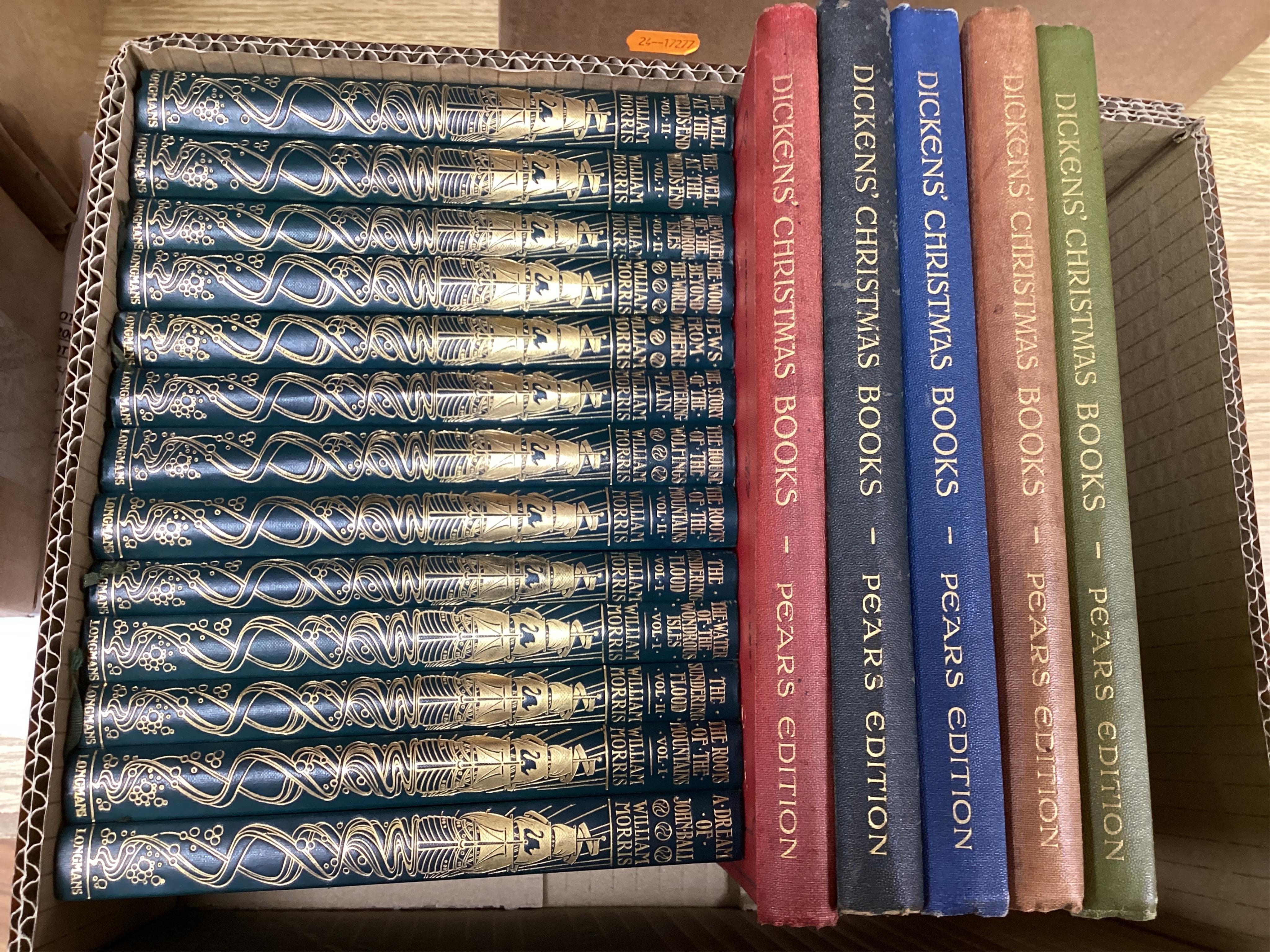 ° Morris, William. Prose Works, 13 vols in Longmans Pocket Edition. Original blind pictorial cloth, gilt pictorial and decorated spines, sm 8vo. 1913-14. Sold with Dickens, Charles - The Pears Edition of the (5) Christmas Books. num. illus. to each by Charles Green (Cricket on the Heath by L Rossi); original decorated cloth, coloured inset on upper boards (ca.1925) (18)