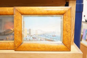 Lot 708 , Neapolitan School, Mount Vesuvius erupting and a coastal promenade, pair of naive gouaches, maple framed, 15 x 22cm