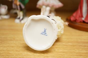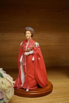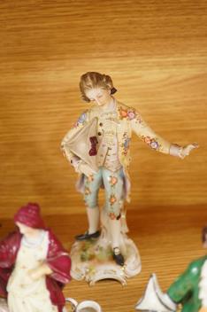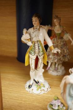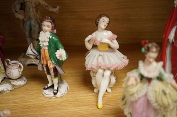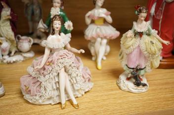 Lot 384 , Nine continental figurines, to include Dresden porcelain lace examples, together with a resin figurine of Queen Elizabeth, largest 23cm high