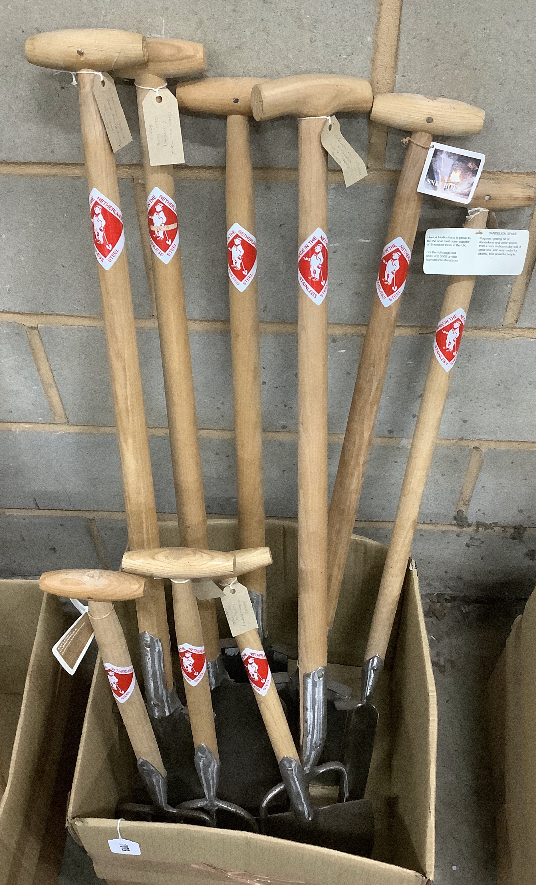 Nine unused Sneeboer, The Netherlands, garden tools, including; a shovel, a weeding fork, a ladies spade, a dandelion weeder, a potato fork, a transplanting spade, a draining spade, a strawberry spade, and a digging fork