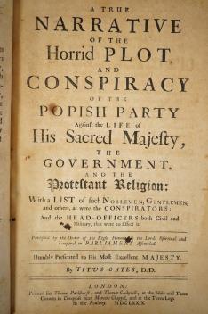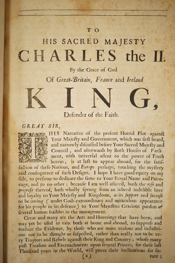 ° Oates, Titus - A True Narrative of the Horrid Plot and Conspiracy of the Popish Party against the Life of His Sacred Majesty, the Government, and the Protestant Religion: with a List of such Noblemen, Gentlemen, and Others, as were the Conspirators: and the Head-Officers both Civil and Military, that were to effect it ... licence leaf before title and (9), 68pp. modern marbled boards with paper label on upper, folio. printed for Thomas Parkhurst, and Thomas Cockerill ... 1679