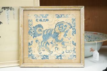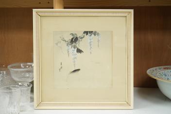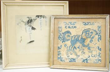 Lot 1745 , Ogata Gekko (1859-1920), Wisteria and carp, Japanese woodblock print and a Chinese woodblock of a lion dog, 23 x 23cm