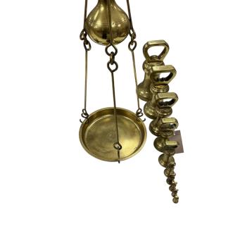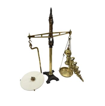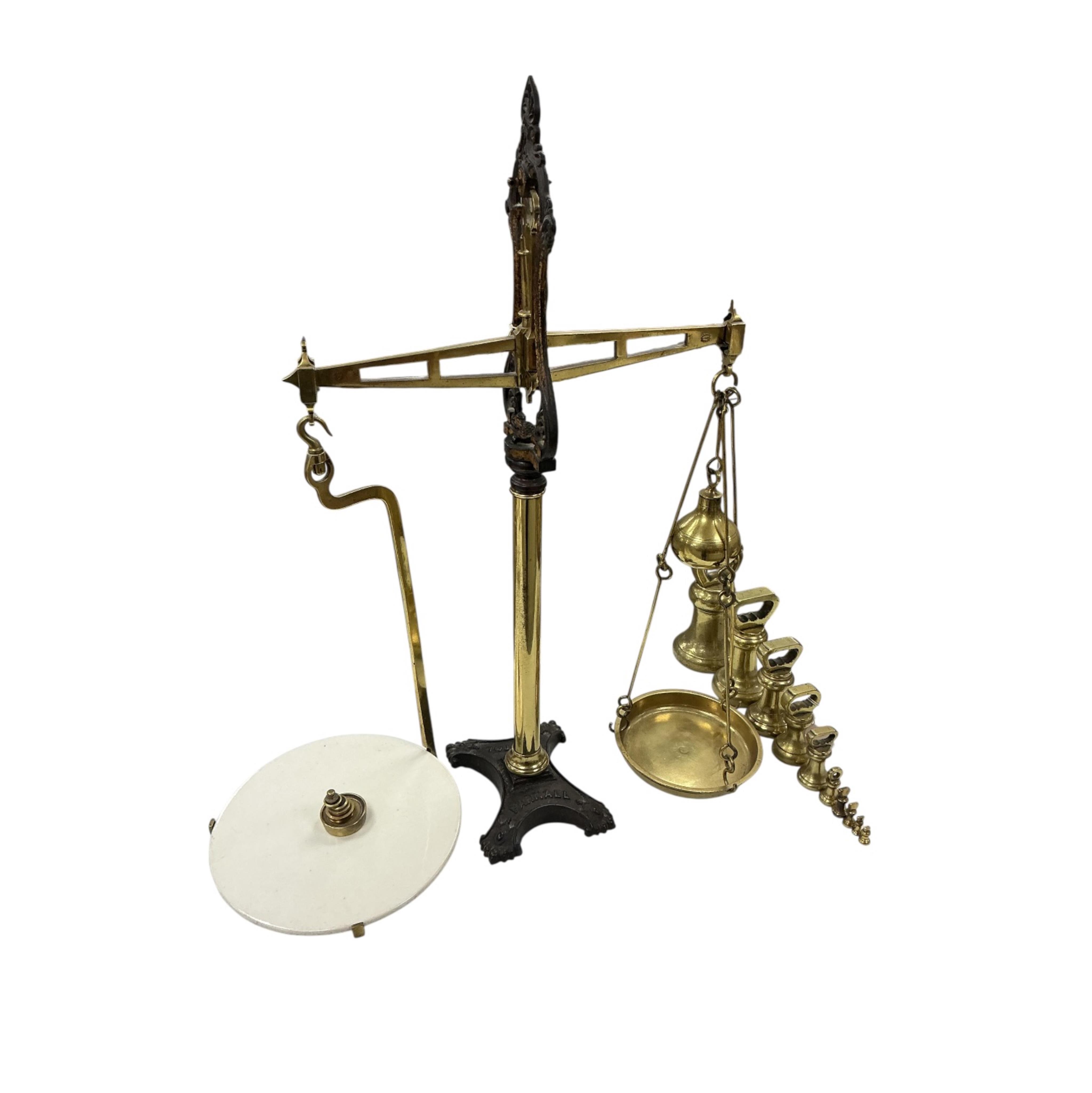 Lot 1279 , Parnall Bristol brass and iron pan scale with ceramic stand and weights together with another of ten graduated brass weights