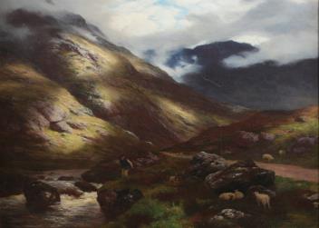 Lot 169 , Peter Graham, 1836-1921, Highland landscape with an angler and flock of sheep