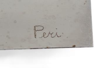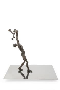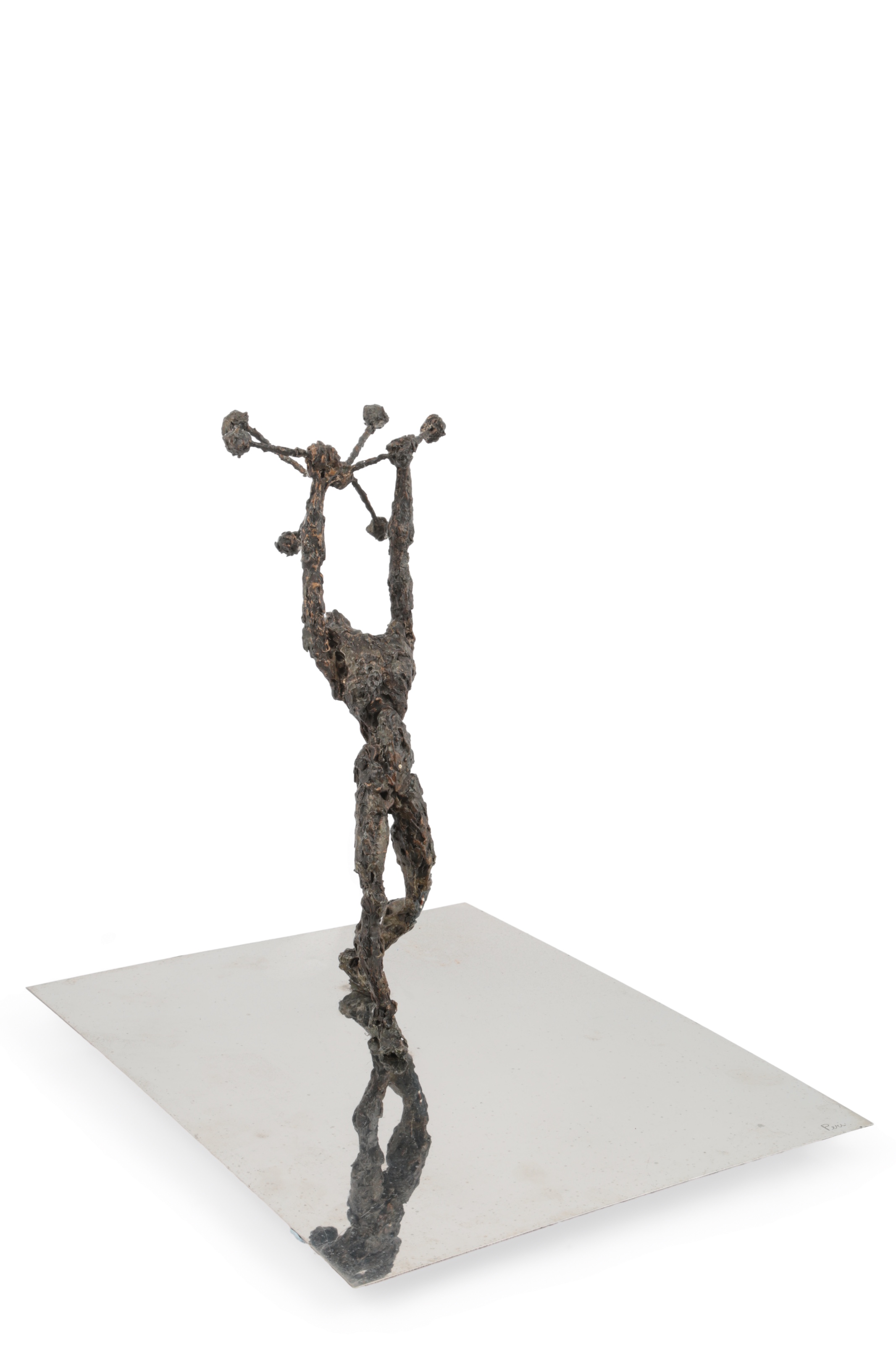 § Peter Laszlo Peri (Hungarian/British, 1899-1967) 'Mastery of the Atom' a figural sculpture in bronzed resin, attached to a chromed rectangular panel, signed "Peri" to the panel lower right, 38cm x 30.5cm x 37cm