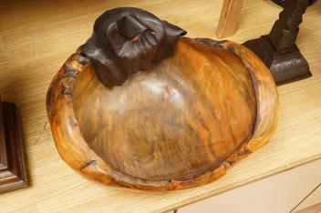 Pierre Decorse (b.1953), a large naturalistically modelled bowl carved with a cloaked figure, 42cm wide