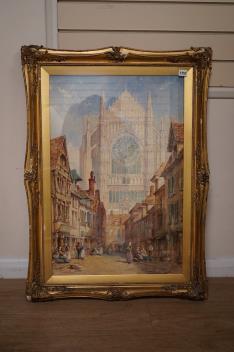 Lot 1757 , Pierre Le Boeuff (French, fl.1899-1920), View to Beauvais Cathedral, signed, watercolour, ornate gilt framed, 74 x 48cm