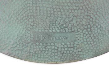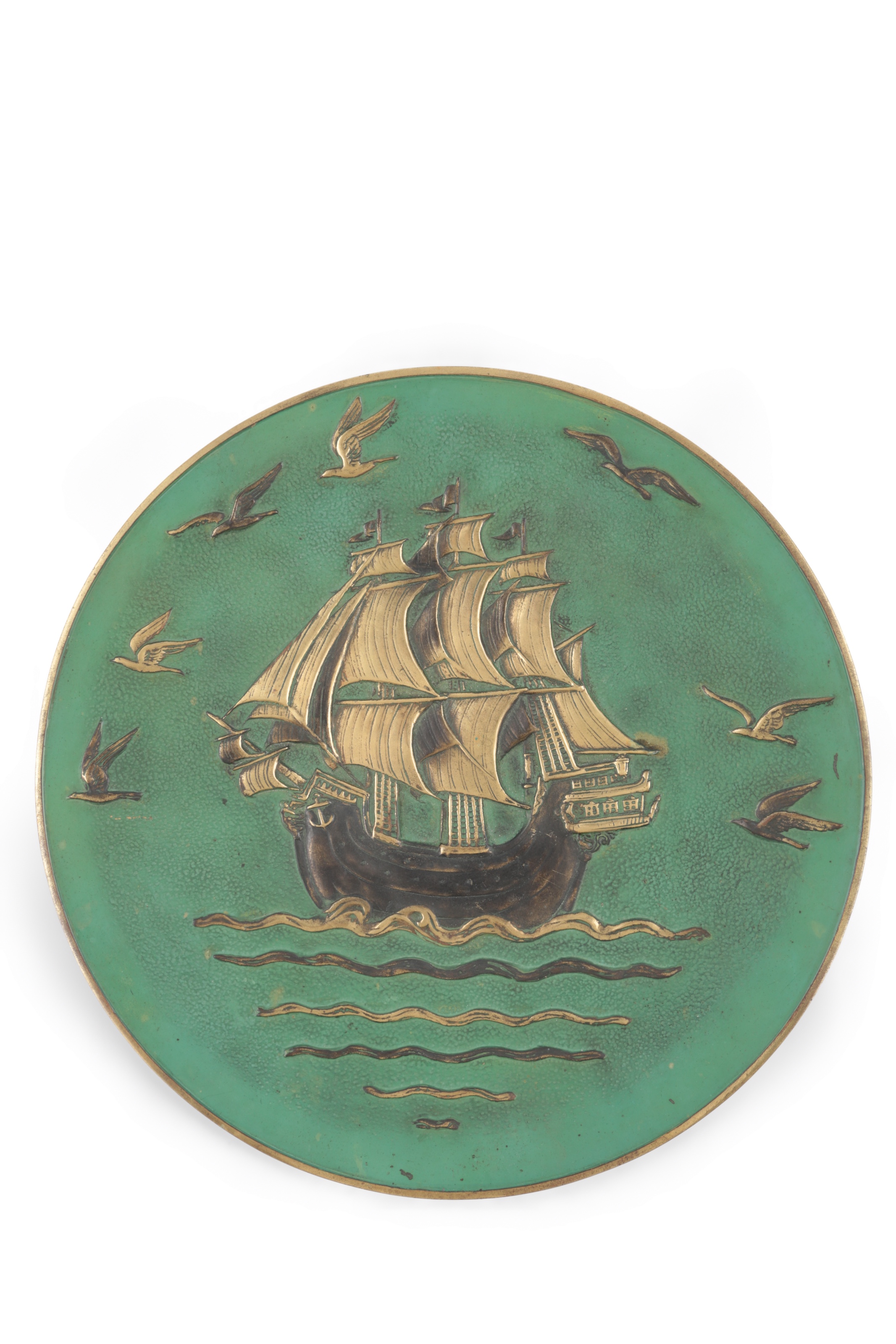 Pierre Le Faguays (French, 1892-1962) A bronze galleon dish, decorated in relief with a three-masted ship in full sail, birds and waves against a textured green ground, signed to the underside, raised on three small feet and with a suspension loop for hanging, 39cm diameter