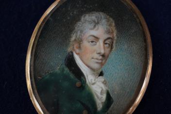 Lot 709 , Regency School, Portrait miniature of a gentleman wearing a frock coat and cravat, oval watercolour on ivory, with hair-work panel verso, 6 x 4cm, housed in a gilt metal pendant frame CITES Submission reference 75C3EP3V