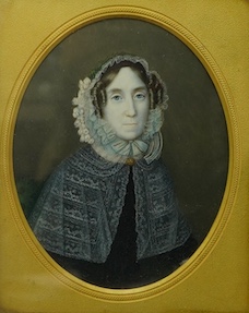 Regency School, Portrait miniature of a lady wearing a bonnet and lace shawl, oval oil on ivory, housed in original frame, 10.5 x 8cm CITES Submission reference 1GKQWZA5
