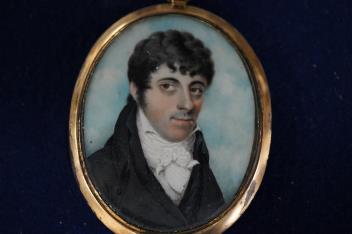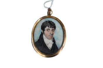 Lot 703 , Regency School, Portrait miniature of a young gentleman wearing a frock coat, oval watercolour on ivory, 6 x 4.5cm, housed in a gilt metal pendant frame CITES Submission reference K7AFBZFN