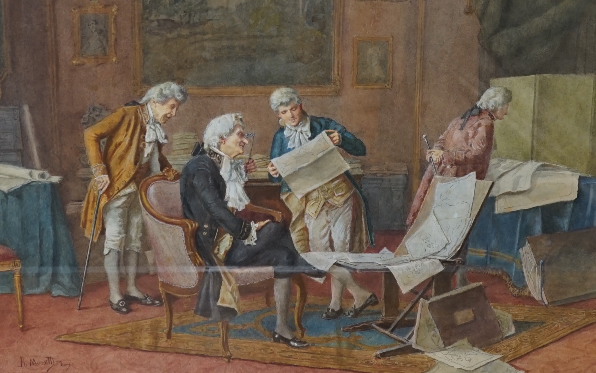 Lot 1743 , Renato Moretti (Italian, 1863-1913), watercolour, 'Old Prints', signed and inscribed, ‘Rome’, 35 x 54cm. Condition - fair, minor discolouration to the paper
