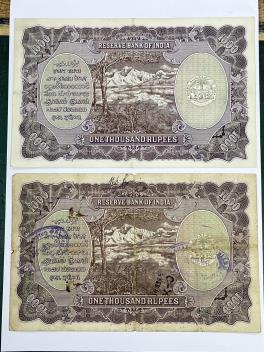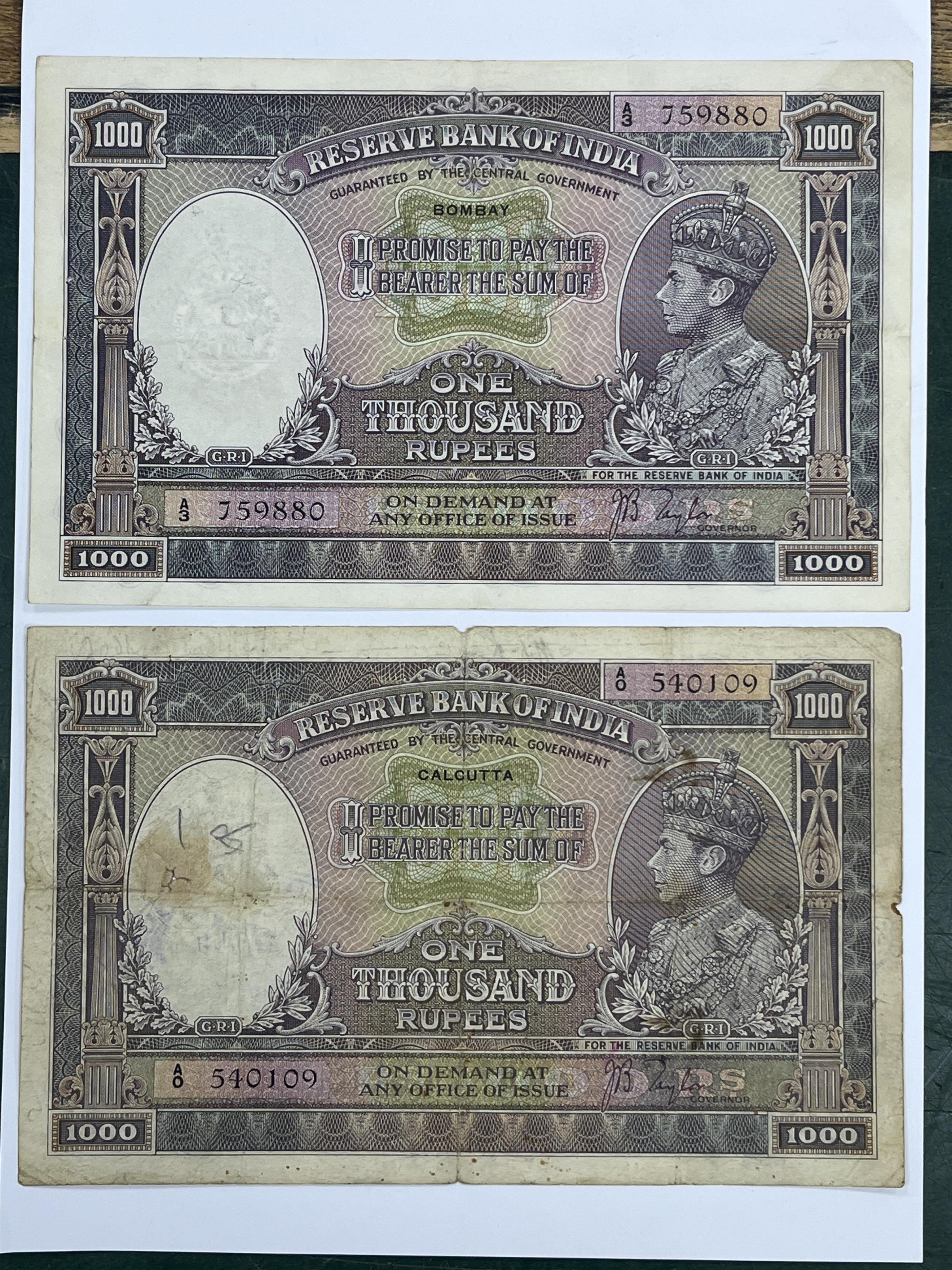 Lot 2072 , Reserve Bank of India banknotes, 1000 Rupee banknotes (1937), Bombay issue, Taylor signature, serial number A3 759880, pin holes, folds, unusually absent of graffiti, scarce, and, 1000 Rupees (1937), Calcutta issue, Tayl