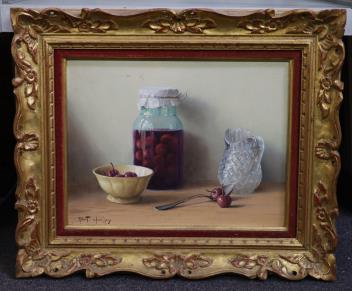Lot 384 , Robert Chailloux (French, 1913-2006), Still life of cherries in a jar and bowl beside a glass jug, oil on board, 26 x 34cm