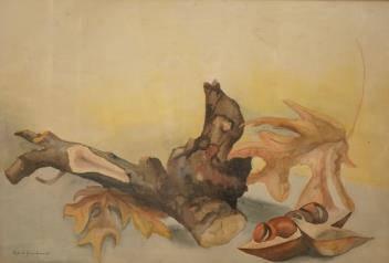 Robert Duckworth Greenham (1906-1975), still life of bark and leaves, signed and dated ‘47, 39 x 58cm