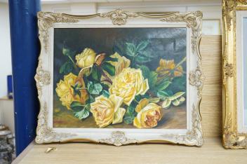 Robert Louis Raymond Duflos (1898-1929), Still life of yellow roses in a vase, signed, pastel, together with a similar oil on canvas, unsigned, largest 33 x 42cm, each in ornate frames