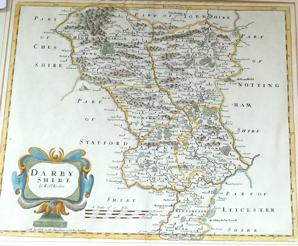 Robert Morden, coloured engraving, Map of Darbyshire (sic), 37 x 42cm