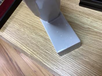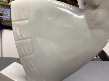 Light crack at her ankle area, 7th image; series of pale spots at top of plinth, 8th image; light crazing throughout, 9th image; otherwise good.
