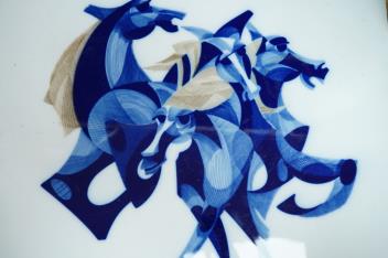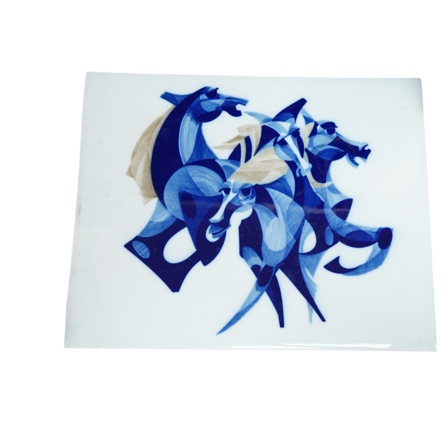 Lot 3138 , Roch-Popelier, a mid century French porcelain panel decorated with stylized horses, 36 x 45cm.