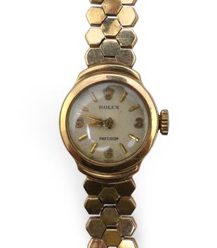 Rolex, a lady's gold wristwatch, circa 1957, the circular dial with baton indicators and hands, to a plain gold bezel, and an articulated bracelet composed of hexagonal linking, case width 17mm excluding winder, bracelet length 17cm, manual winding movement, case back interior, dial, movement and bracelet signed Rolex, British hallmarks for 9ct gold, maker's mark B&S, numbered 318273, gross weight 23 grams
