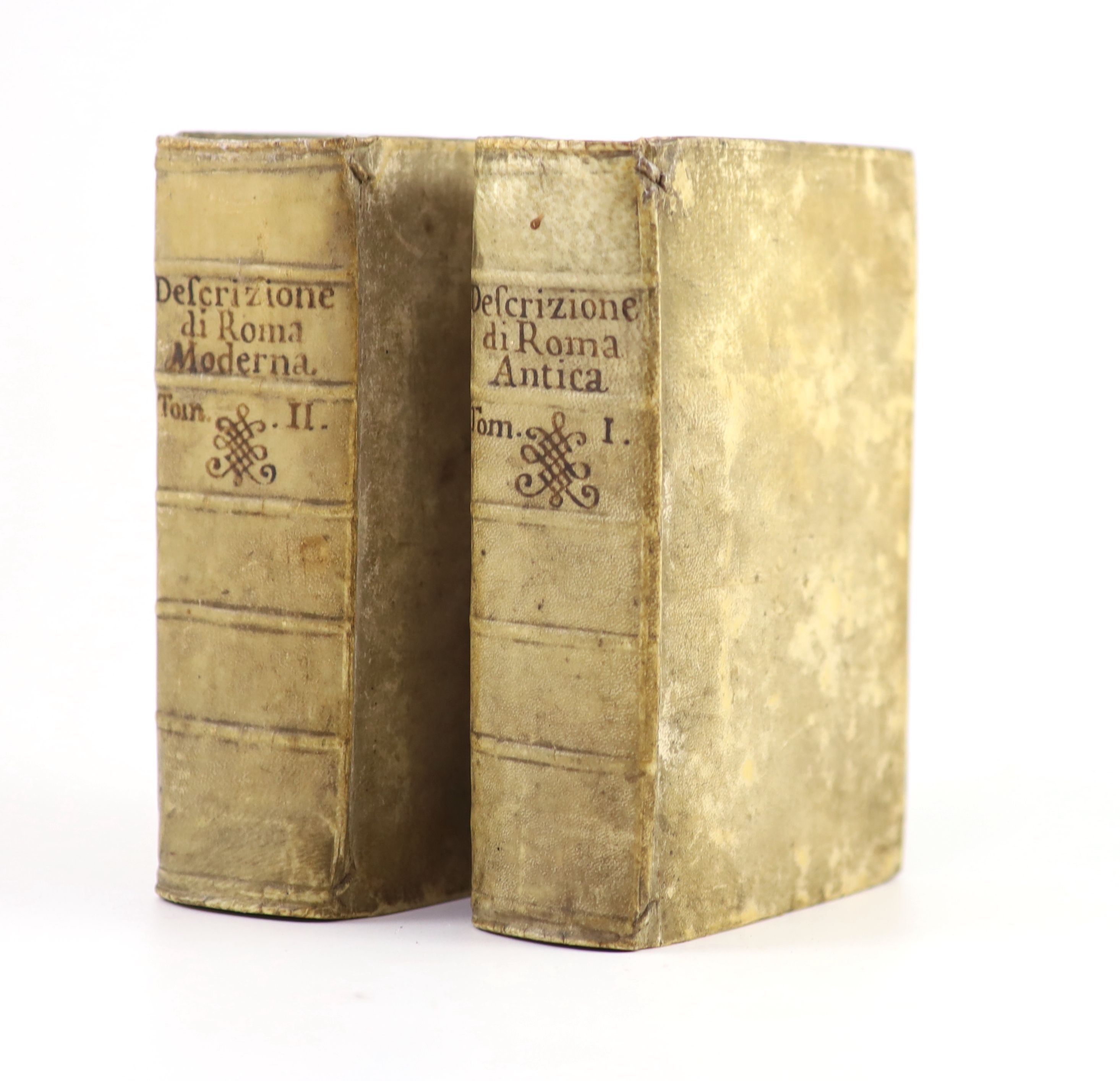 ° Rossi, Filippo de, et al. Descrizione di Roma Antica, and ... Moderna, 2 vols, 8vo, contemporary vellum, 2 engraved frontis pieces, 4 folding maps and plans, 184 3/4 page text engravings, Libroria di Michel Angelo et al, Rome 1707