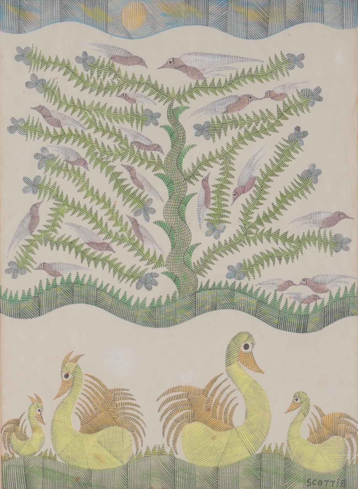 Scottie Wilson, (1891-1972), Ducks beneath a tree full of birds