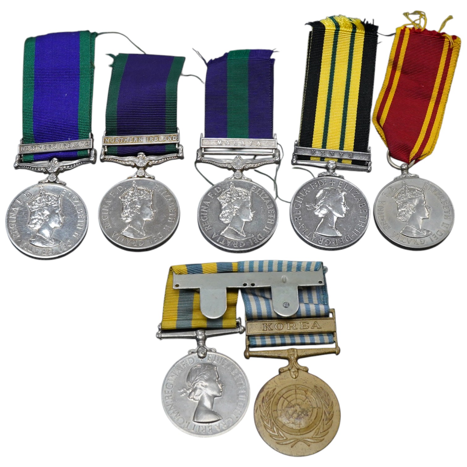 Seven ERII military medals; a GSM awarded to 22774467 SPR. H. Weir. R.E., with a clasp for Malaya,