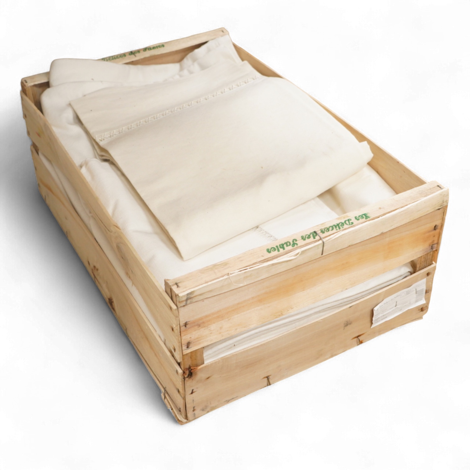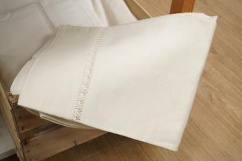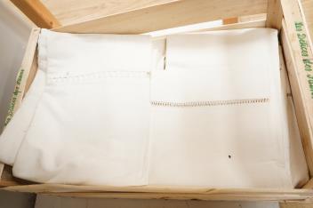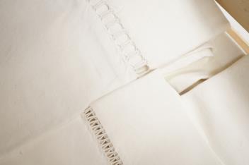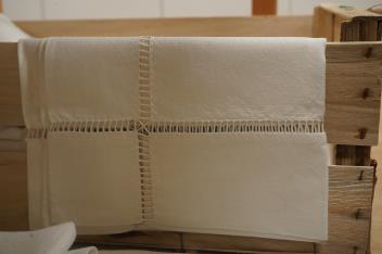Lot 1315 , Seven French provincial coarse linen top sheets with embroidered monograms and drawn thread turn backs