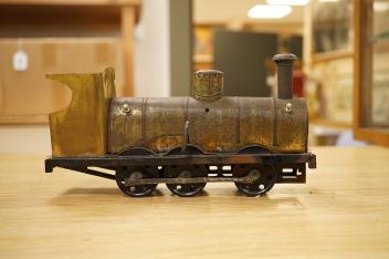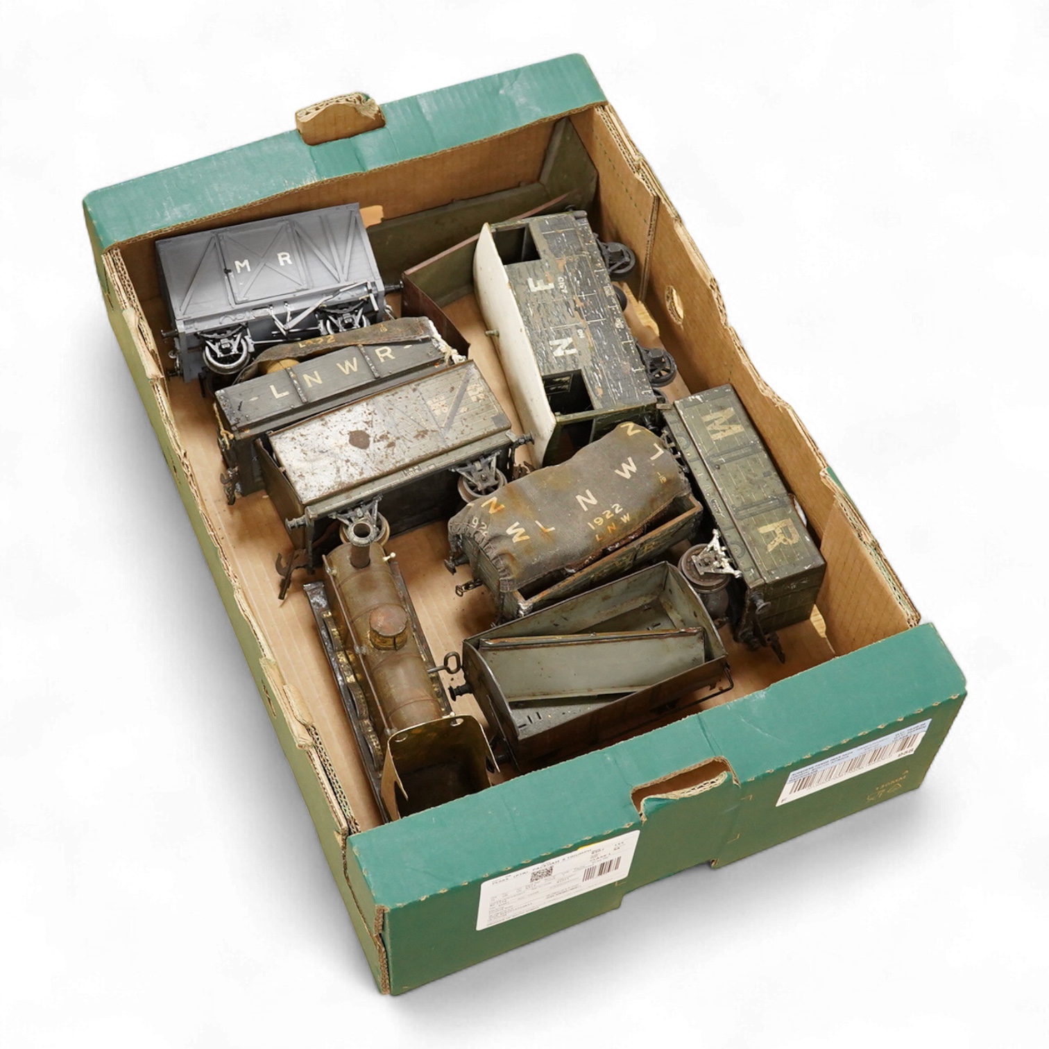 Lot 293 , Seven Gauge One coarse scale railway freight wagons, by Bassett-Lowke, etc., including tinplate and wooden examples in liveries for LNWR, Midland Railway, and LBSCR, together with the remains of a scarce late 19th centur