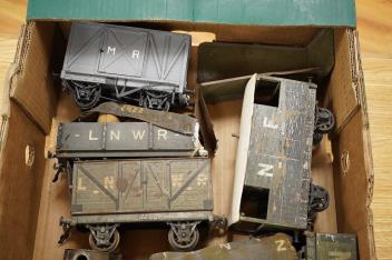 Seven Gauge One coarse scale railway freight wagons, by Bassett-Lowke, etc., including tinplate and wooden examples in liveries for LNWR, Midland Railway, and LBSCR, together with the remains of a scarce late 19th centur