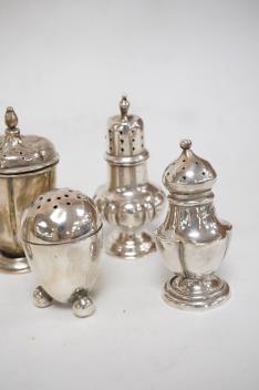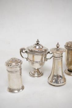 Lot 1017 , Seven assorted late 19th/early 20th century silver condiments including one modelled as a two handled trophy cup, Horace Woodward & Co Ltd, London, 1899, 67mm.