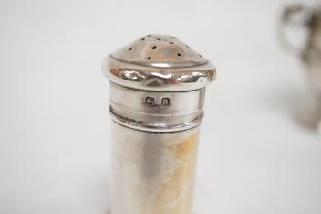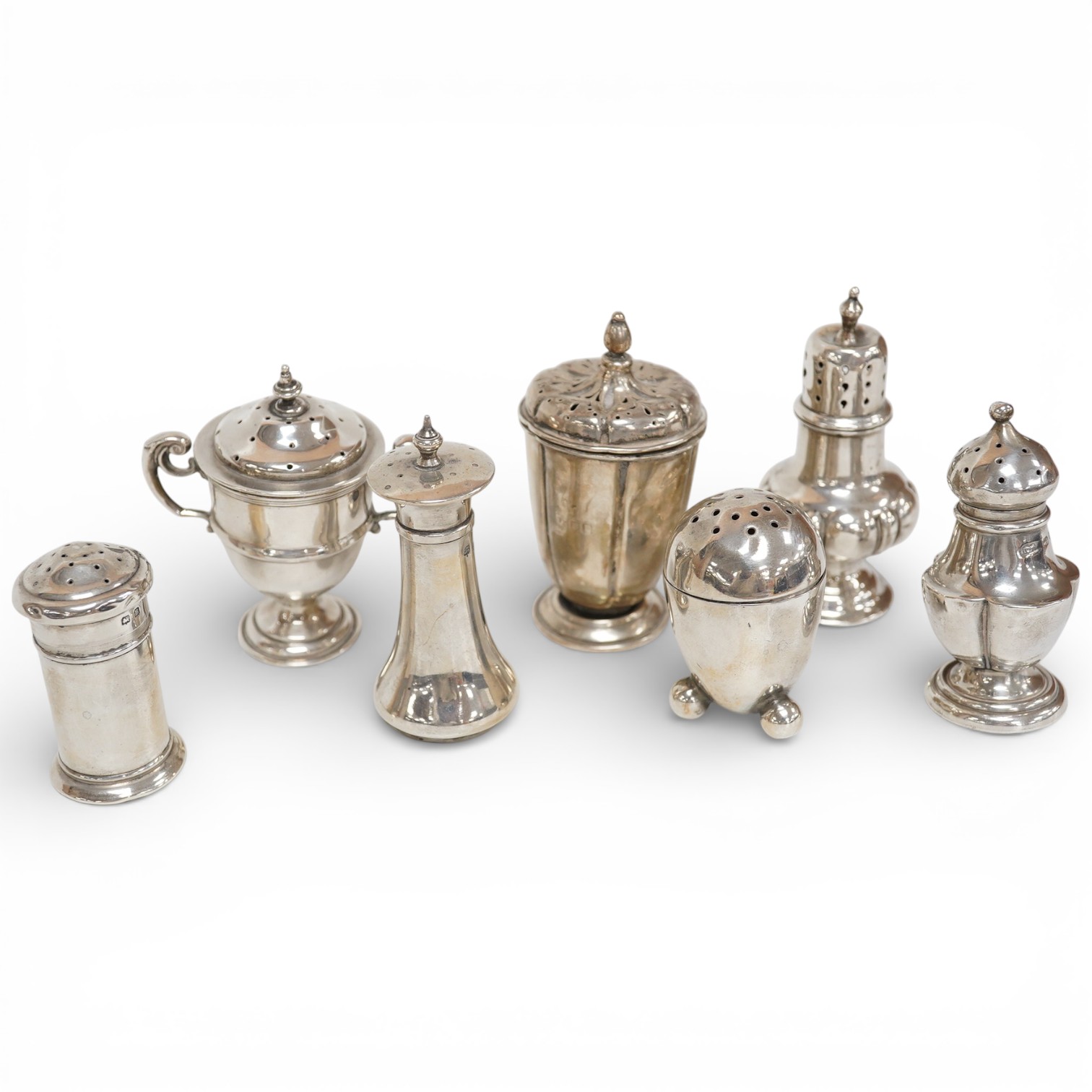 Seven assorted late 19th/early 20th century silver condiments including one modelled as a two handled trophy cup, Horace Woodward & Co Ltd, London, 1899, 67mm.