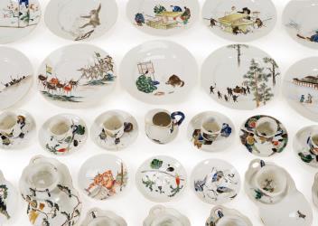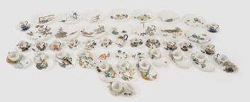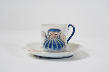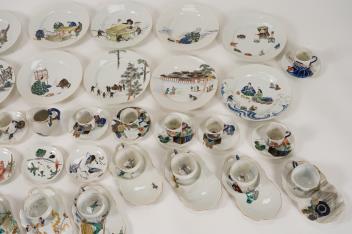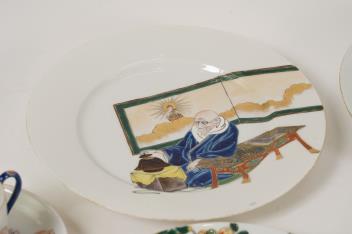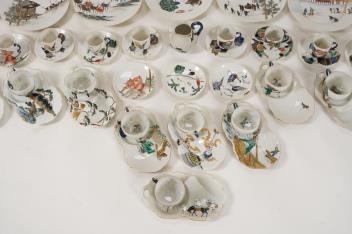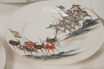 Shoko Takebe for Thomas B. Blow, a fine Japanese eggshell porcelain tea and coffee set, dated 1905, finely painted with different scenes from Japanese folklore including oni, foxes, fish in costume, white rabbits in costume, monkeys and crabs battling, cats trapping a dog, bird like human figures, landscapes etc., the saucers and plates with gilt marks for Shoko Takebe and Thomas B. Blow and dated 38th year Meiji period, Plates 21.5cm diameter, saucers 12cm diameter