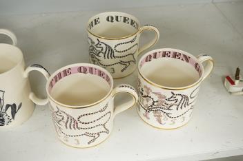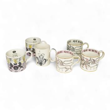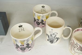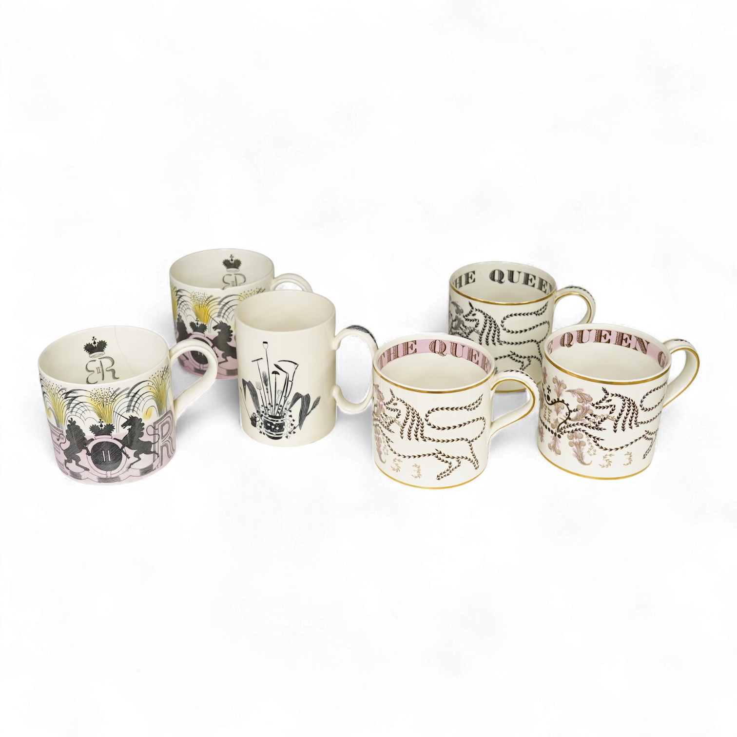 Lot 1362 , Six Wedgwood Commemorative mugs comprising Eric Ravilious 1953 Coronation of Queen Elizabeth examples and a 1939 Garden Implements example, largest 12cm high (four a.f)