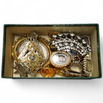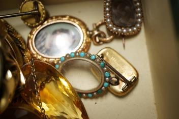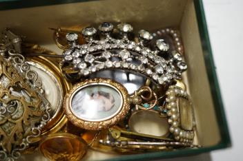 Six assorted 19th century mourning brooches including William IV yellow metal with plaited hair date 1834 and George III with split pearl and hair, largest with carved wax? panel depicting deer, 56mm, together with other jewellery including a Portuguese yellow metal and enamel pendant, a paste set coronet broch and a yellow metal mounted citrine set pendant, etc.