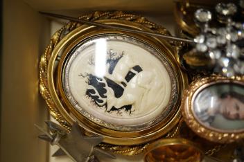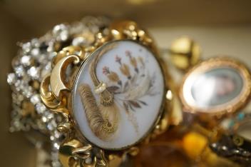 Lot 1920 , Six assorted 19th century mourning brooches including William IV yellow metal with plaited hair date 1834 and George III with split pearl and hair, largest with carved wax? panel depicting deer, 56mm, together with other
