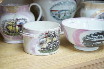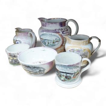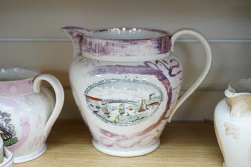 Lot 516 , Six early 19th century commemorative jugs and bowls, three with transfer printed scenes of the cast iron bridge over the River Wear commemorating the opening in 1796, together with three others with naval themes, largest