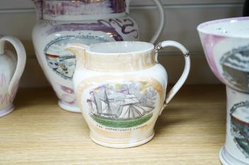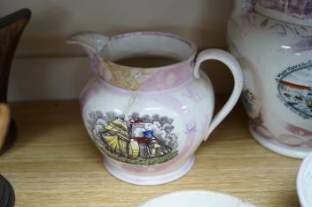 Six early 19th century commemorative jugs and bowls, three with transfer printed scenes of the cast iron bridge over the River Wear commemorating the opening in 1796, together with three others with naval themes, largest 22cm high