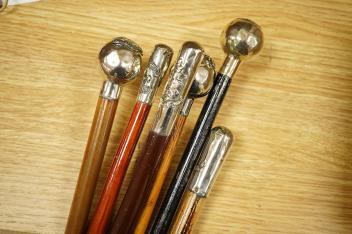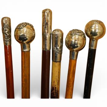 Six military swagger sticks, two with ebonised finish, all with white metal mounted tops, including; Princess Louise’s regiment, the Kent Cyclist Battalion, the Queen‘s Own West Kent regiment, etc.