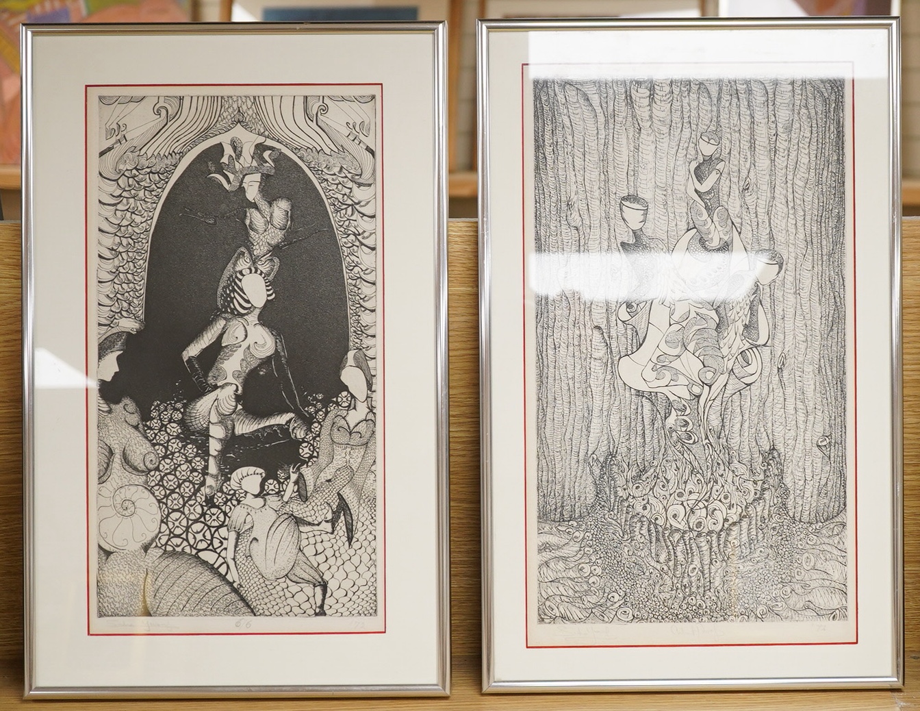 Suha Yusuf (Iraqi, b.1950), surreal figural compositions, each signed and dated ‘72 to the margins, one limited edition, one artist proof, pair of etchings, 39 x 21cm