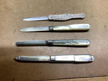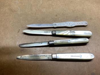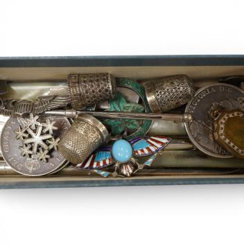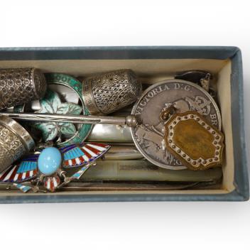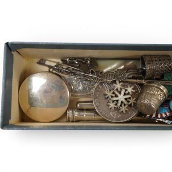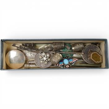 Lot 854 , Sundry collectables including silver and sterling pens, four folding fruit knives, a pill box, coins, brooches including 900 and enamel, swizzle stick, thimbles etc.